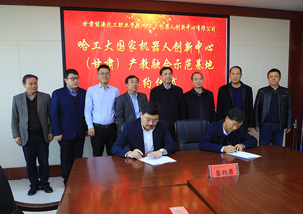 仪式最后,在与会嘉宾的共同见证下,哈工大机器人创新中心副总裁岳洪浩与我院院长吴兰州签订“哈工大国家机器人创新中心(甘肃)产教融合示范基地”协议。